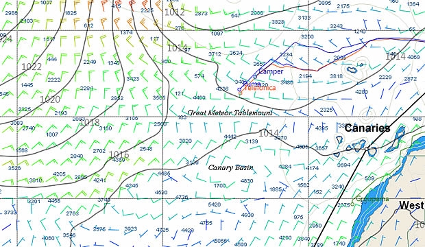 In fact it looks like the tables will turn very much in favour of the westerly group as the area of high pressure to their southeast edges towards the African coast, causing Groupama to slow later today and over the course of Saturday, before the trades establish themselves properly over the breadth of race course on Sunday and we have a yacht race on our hands once again, rather than a meteorologist's lottery.