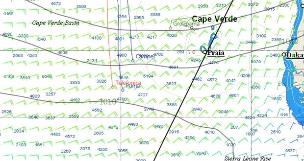 It looks like the boats have made the call on where they wish to cross the Doldrums and if this is the case then Puma will pass through at around 29°W, where at present the Doldrums have dropped a little further south than when we last looked - from 5°N to 2.5°N - or around 420 miles away still. Given that Puma has covered around 409 miles in the last 24 hours, this means that Ken Read's team will be making the crossing tomorrow afternoon. Further west the Doldrums appear to be further north, between 5-8 °N, which is probably why both Telefonica and Puma have put a bit more left hand down into their courses.