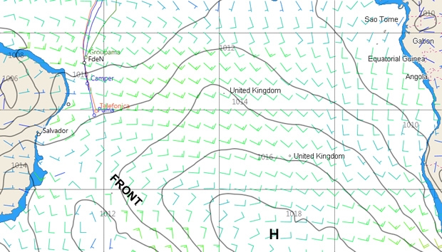 With the main area of high pressure in the South Atlantic due to make its exit into the Indian Ocean, so the wind is set to lighten today for the leaders. However the tactical teams on the two boats will also be keeping an eye on a secondary depression due to form today along the weak front reaching north up from a depression in the Southern Ocean. This localised depression is forming some 700 miles due south of them, at the latitude of Rio. With these two features the wind is set to head them for a few hours tonight before the easterlies resume and the enormous area of high pressure currently off the coast of South America takes up resident across the breadth of the South Atlantic on Sunday. This will leave a 1500 mile long clear runway of easterlies/northeasterlies.