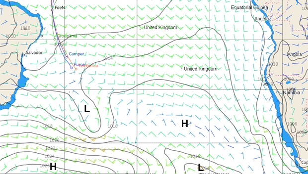 Heading east at this stage of the leg to Cape Town is unusual (compared to what the boats did in the last race here). While they have been prompted to make this move early thanks to the depression to their south, in fact the all-important weather in the south of the South Atlantic now appears to be panning out well for the leaders. The high a long way to their south, currently centred at 40°S 32°W, is forecast to track slowly east and then slightly northeast so that its centre is around 35°S 08°W come lunchtime Tuesday. This is suitably far east so that the leaders should be able to make it around the southwest side of the high in favourable winds. The even longer term forecast has a depression rolling through to the south towards the end of next week causing the high to recede north and the leaders to be able to set a course directly to Cape Town in good pre-frontal conditions, although possibly not record breaking. In short it looks like they are going to be able to sail very much fewer miles than they have had to in the past on this leg.