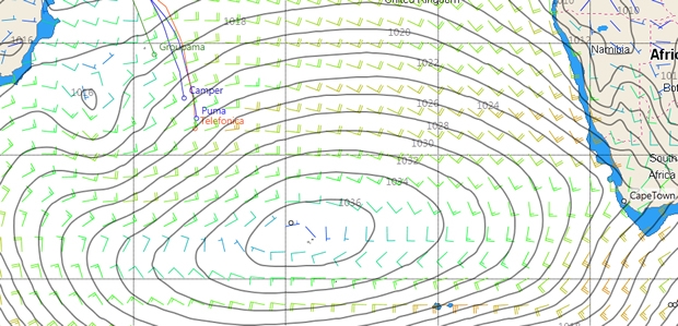Tomorrow night the boats will be able to turn west again as not only will they be southwest of the high but over the course of tomorrow the high starts moving ESE, encouraged along by the onset of a Southern Ocean depression and the front associated with it. This is typically the part of the course where 24 hour records are broken and if Ericsson 4's present distance of 596.6nm, set during the last fully crewed round the world race, is to fall then we reckon Thursday could be the day for this to happen in the strong northwesterlies and relatively flat water preceeding the front.