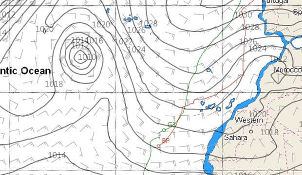 The blue 40m trimaran's progress south hasn't been that straightforward. Typically the aim is to leave when the Azores high is well established with the trade winds to its southwest - so the Doldrums in one gybe. However on this occasion the high started off over the Azores but has since been squished north as a depression has developed to the southwest of the Azores. As a result Banque Pop has had to gybe south to remain close to the Portugese and African coasts and yesterday struggled as she tried to pass down the west side of the Canaries. Nonetheless she is still ahead and now into the Trades she has the opportunity to pile on the miles south to the Doldrums.