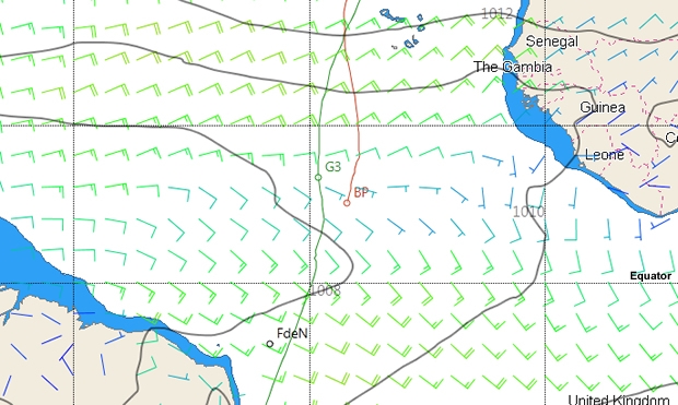 It seems likely that after the Equator Banque Populaire will follow a similar course to the one Groupama 3 took, but more to the east as in the southeasterly trades they will be attempting to make the best VMG south until such time as the trades start backing into the east as they pass Recife.