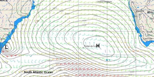 Over the next 48 hours this depression eases slowly east, out into the south Atlantic, the breeze continuing to build and it looks like Banque Populaire will be enjoying a 'lively' day over Thursday night and into Friday as she flies down the band of 30 knots northerlies/NEerlies between the depression and the high. The crew will no doubt be crossing themselves at this point as this is where the maxi tri suffered a collision forcing her to quit her last round the world record attempt.