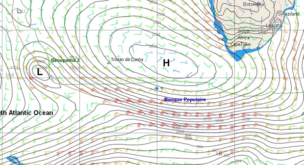 Tomorrow, as Banque Populaire heads into the Indian Ocean sector of the Southern Ocean, skipper Loick Peyron will be faced with a decision. If he wants to continue on in the strong winds that bring the really impressive speeds, he's going to have point Banque Populaire south once again, from around 45°S deeper into the Roaring 40s and with this comes the increased risk of encountering ice. Alternatively he stays at 45°S where on Sunday the wind will lighten to around 20 knots, but their course will allow the big tri on Monday to pass north of the Prince Edward Islands at the beginning of the sub-Antarctic Indian Ocean chain. Unfortunately come Tuesday there will be no option other than heading south, as an area of high pressure is forecast to descend to 45°S blocking her way. So Banque Populaire will probably leave the Crozet Islands to port as they descend to around 50°S forcing them south of the Kerguelen Islands. While Groupama 3 managed to play it safe, staying way north of the Kerguelens, in fact on past Jules Verne Trophy attempts the majority of contenders have left this remote French-owned archipelago to port. Once past the Kerguelens, there will once again be the opportunity to make big speeds with the on-set of the next front.