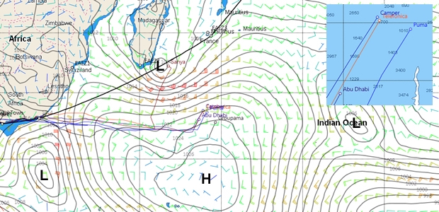 Telefonica, Puma and Camper managed finally to break through the pesky trough yesterday morning and in the process put some miles on the Ian Walker-skippered Abu Dhabi Ocean Racing, which being further to the south didn't successfully break through until mid-afternoon. But significant tactically was how far east into the high the boats sailed before they tacked north. Camper and Telefonica made their move at 1700 yesterday, whereas Puma left it for another hour, setting themselves up some 40 miles to the east of the other two. Abu Dhabi didn't tack north until 2030 UTC last night. In their present trek NNW, Abu Dhabi is now some 85 miles astern of her rivals, although below Ian Walker doesn't discuss how their deficit came to pass.