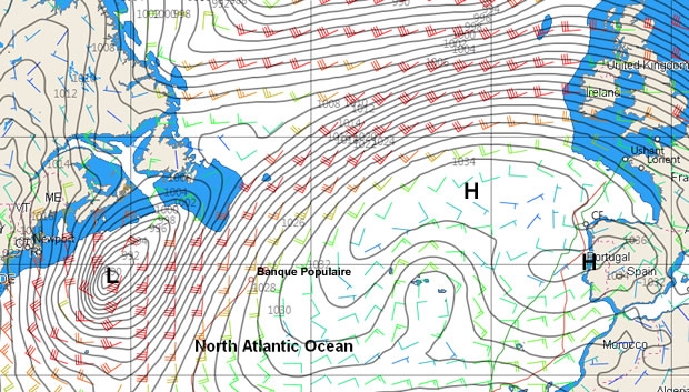 As the chart above shows, the plan is to circumnavigate the substantial zone of high pressure to her east. Essentially the situation above should remain fairly similar for the rest of the week, only that the depression off the eastern seaboard of the USA moves northeast, its centre passing south of Greenland on Thursday and en route this has the effect of compressing the western side of the high. This will be good news for Banque Populaire for as the high shrinks and consolidates between Portugal and the Azores come Thursday-Friday, they should be able to sail a less circuitous route to get to the Lizard-Ushant finish line.