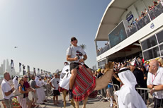 The enduring image of that victory in Spain was of a jubilant Adil Khalid, the first Emirati sailor to take part in the race, and the 23-year-old Abu Dhabi crewman was at the heart of the action again as waved a giant United Arab Emirates flag to the home crowd before being launched into the water by his team mates.