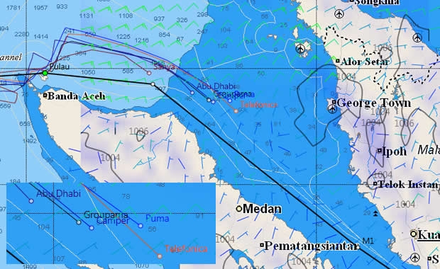 Tightly grouped yesterday lunchtime (UTC) as they passed the Pulau We island off the northern Sumatra, so over the course of the night (their morning), the fleet has expanded out again with Puma back into second place and with Sanya dropping further astern at the back of the fleet. It is not entirely clear looking at this by remote, even with high resolution GRIB,s why this is happening as it appears that the leaders should be sailing into less pressure, however at present Telefonica seems to be the fastest boat in the fleet, going some two knots quicker than Puma, and as a result has extended her lead to 12 miles.