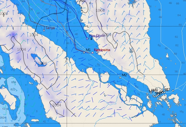 In the early hours of this morning, Telefonica tacked to cover Puma and Groupama but with the wind going light and shifty, so the two chasing boats were able to catch right up with the Spanish race leader and at the latest sched the three boats are back to being within sight of each other as they attempt to make ground down the strait. Meanwhile now 27 miles astern of the leader, with the wind returned Camper is still attempting to fend off the challenge from Abu Dhabi, now just a mile astern of her, although both boats are sailing at more than twice the speed of the leaders and look set to close the gap on this group. Bringing up the rear, Sanya's tactics of keeping to the Sumatran coast seem not to have paid and she has dropped back to 132 miles off the lead.
