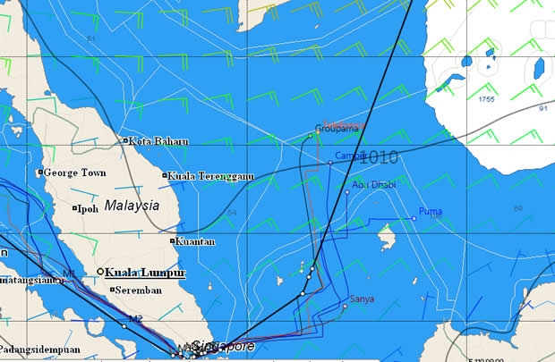 With the boats upwind, so more tactical options have become available to the teams and one boat to take the plunge and split from the fleet has been the Ken Read-skippered Puma. At 1900 UTC last night, the US team tacked on to port...and kept going, apart from a brief hitch back to the north to avoid the island of Natuna. In his latest blog Puma's MCM Amory Ross explains their reasoning (see here) - essentially they prefer how the routing looks heading east early and this will involve less tacks. However this risky move has dropped them back to fifth place.