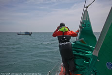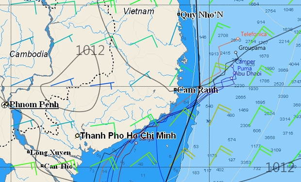 Yesterday afternoon Puma reconvened with the fleet, tacking just short of the Vietnamese coast just over a mile ahead of Abu Dhabi and 9 miles astern of Camper and then took up the challenge of slogging their way past the southeast corner of Vietnam.