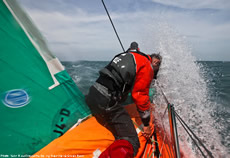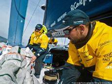 Over this period Telefonica, the race leader and overall race leader, has extended from second placed Groupama but this has mainly been down to incidents that occurred on the French VO70. As Yann Riou, Groupama’s MCM described it: “One or two panics, first with an impact with an non-identified floating object last night, which touched the keel first and then the windward rudder… No apparent damage.And then, more importantly, the main sail sheet broke. It was fully loaded at that time – ie. three tonnes. Thankfully we managed to repair it in 10 minutes. We lost some miles but above all it was a big scare.”