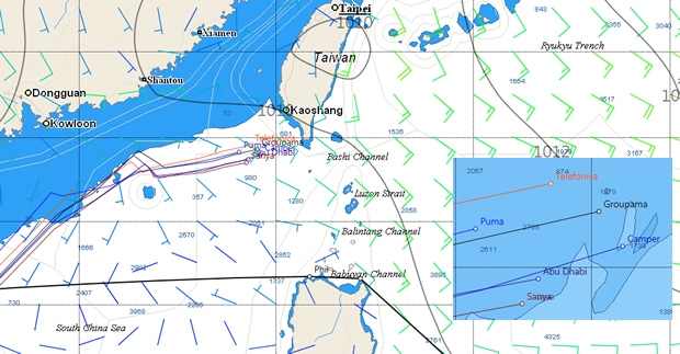 To avoid an area of high pressure lurking around the north of the Philippine Island of Luzon, so the Volvo Ocean Race boats have been erring north and are about to pass through the Luzon Strait on its north side, shaving the south side of Taiwan.