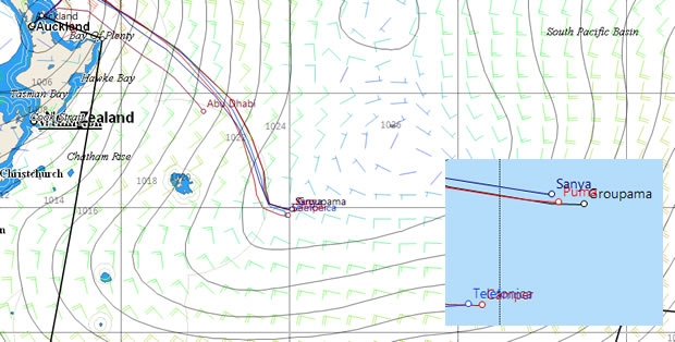 Meanwhile Camper has been trying a 'buffalo girls' move to the southwest of the leaders but so far this has not really worked - she doesn't appear to have benefitted from any more pressure or better wind angle despite being further from the centre of the high. However there may be something in their tactic as Telefonica this morning took a hitch south to fall in behind the Kiwi crewed Spanish boat, a move that caused her to fall to fifth place, albeit just 11 miles off the lead.