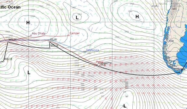 Meanwhile Abu Dhabi is getting up to speed. Although the GRIB file indicated in the chart above shows her still to be on the perfery of the high, in fact the wind is now up to 20 knots from the WNW. At some point today however the rollercoaster ride will begin for Ian Walker's crew with a cold front approaching bringing with it 30-35 knot winds. It would be nice to think that Abu Dhabi might be able to hang on to the strong northwesterlies ahead of this front and the flatter water that will allow her to make big speeds, unfortunately it doesn't look like they will and they too will fall into the southwesterlies behind it with a similar lumpy boat breaking sea state that has caused the damage to Camper and Telefonica. We will have to wait and see.