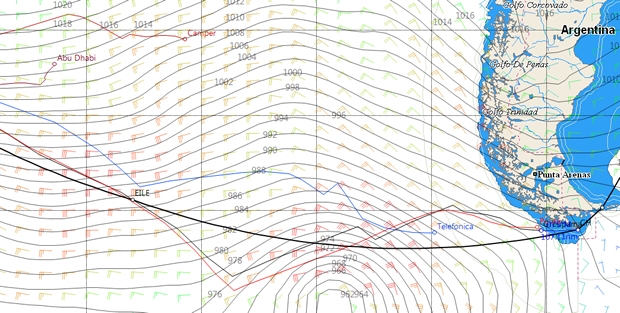For the navigators there are a couple of key decisions to make coming up imminently. Do they pass through the Le Maire Strait between Isla de los Estados and the Argentinian mainland or do they remain offshore, leaving the island to port. This will have longer lasting consequences, as passing through the Strait is likely to mean that the boats will subsequently leave the Falkland Islands to starboard. At present it is hard to say which option will be favourable. Going through the Strait represents the shortest course and generally isn't a good option if there are headwinds off the east coast of Argentina. However at present the situation to the north of the Falklands is evolving rapidly with a high pressure bulb extending east from Argentina on Sunday but replaced by a shallow depression on Monday. Watch this space.