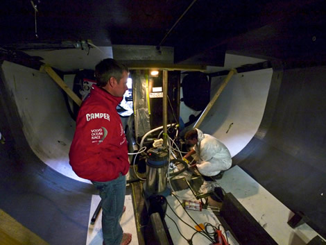 He also counters the “why don’t you throw another 500kg of structure in the boat and finish the race?” argument: If you do this, then your VO70 will simply not measure. “We have a maximum draft of 4.5m, and we have all been floated to that rule. If you started adding weight you won’t have your measurement certificate any more because your draft will be too deep, because every 60kg sinks the boat 1mm. Then, all of a sudden, all of your feedboard and mast datum screws don’t fit and you have an illegal boat.”