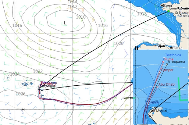 At 2140 UTC yesterday evening, Sanya was the first to blink and tacked north, albeit unable to lay the mark. She was followed around half an hour later by Camper and Abu Dhabi Ocean Racing and then by Puma with Telefonica and Groupama at 2310. Shortly after midnight the wind backed into the west, lifting all the boats up on to course enabling them to lay the western end of San Miguel, the boats subsequently falling into line with Telefonica sneaking back ahead of Groupama at around 0115 UTC, leading the French boat around the turning mark at 0456 GMT this morning, just three minutes ahead. At this point Puma was still only 1.7 miles astern with Camper 5 miles off the leader, Abu Dhabi 8.9 miles back and Sanya bringing up the rear 15.6 miles back from the Spanish VO70.