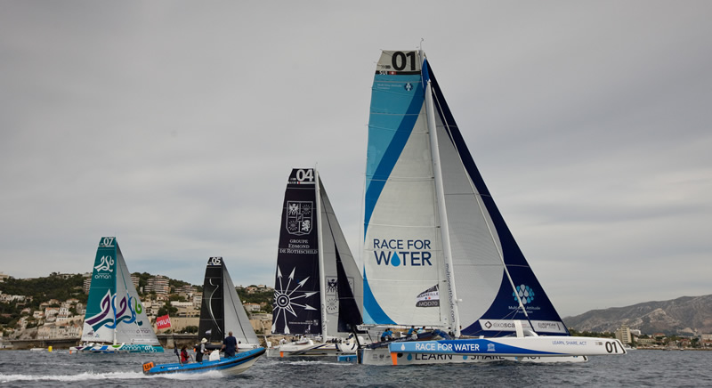 In a day of light winds on the bay off Marseille it was Stève Ravussin’s Race for Water that finished on top of the Marseille City Race series leaderboard, while honours were more or less shared evenly between the two teams which are duelling for the MOD70 European Tour title:Michel Desjoyeaux’s Foncia and Yann Guichard’s Spindrift racing.