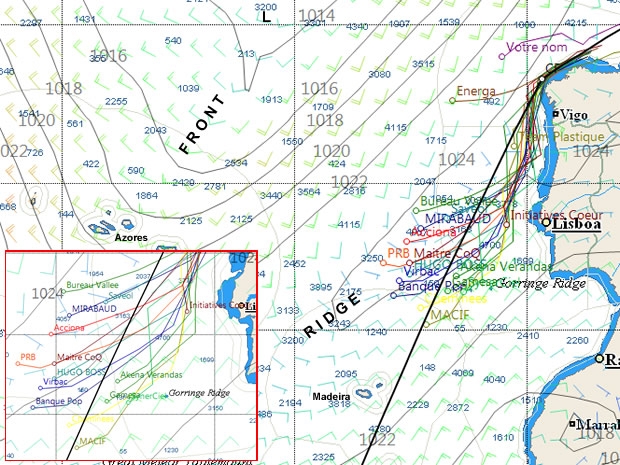 Perennial leader, François Gabart on MACIF continues to be in front and in terms of DTF has extended his advantage to 29 miles at the latest sched, although this by virtue of his maintaining a course that is furthest south. In contrast 2004 winner Vincent Riou on PRB has taken the most extreme westerly course in an attempt to be first through the front associated with the depression forming to their northwest and into the strong favourable breeze beyond. Unfortunately this means sailing through the ridge that the boats have spent the last 48 hours studiously attempting to avoid. As a result at the latest sched PRB is not only pointing further away from the mark, but making just 4.3 knots compared to MACIF's 11. At the latest sched PRB is some 157 miles northwest of MACIF, but this 'westerly investment' has dropped Riou to 8th place.