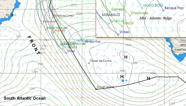The speeds the lead boats are currently making indicates that the chart above is reasonably accurate with Francois Gabart's MACIF, and all the boats west of her in the strong breeze while those to the east, including Bernard Stamm's Cheminees Poujoulat, Alex Thomson on Hugo Boss and Banque Populaire, still in the lighter winds in the perifery of the high to the southwest. The upshot of this is that there looks set to be an almighty convergence tomorrow morning just north of the remote island of Tristan da Cunha, with Virbac Paprec 3 and Banque Populaire expected to be neck and neck.