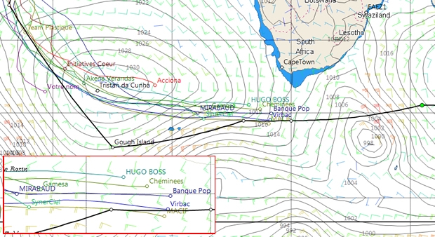 The front that the leaders are awaiting is already with the 'oldies' in the second wave. Here Mike Golding on Gamesa has managed to recover sixth place from Jean le Cam on SynerCiel. Of the three, the French legend le Cam has taken the most extreme option to sweep south ahead of the front, however to the north Golding will be on a better angle to lay the icegate (270 miles away from him) after the front passes and the wind backs into the southwest.