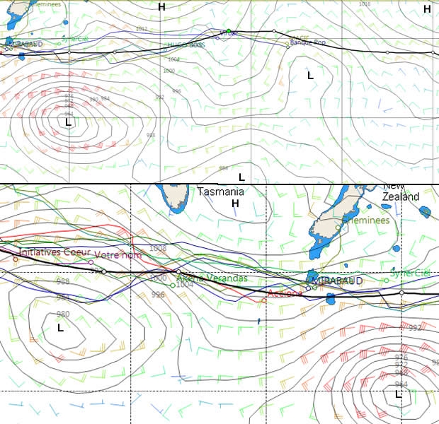 As a result lead 'oldie' Jean le Cam on SynerCiel pulled into fifth place at 1100 yesterday. Le Cam is just about to pass north of the New Zealand icegate and is making good progress ahead of the principle cold front associated with the depression due south of New Zealand.