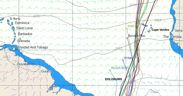 Both Virbac Paprec 3 and Hugo Boss are now out of the Doldrums and into the northeast trades, albeit both on tracks to the west of that taken by the race leaders. Dick may have done this to keep in touch with his British rival who's currently 275 miles to his southwest. While the trades are northeasterly coming out of the Doldrums, they typically veer into the ENE as the boats get further north. At present we can't see any really benefit for Hugo Boss being east - the southwest of her rival, she's directly downwind of her. However the long long term forecast indicates the high to be moving back west by next weekend and Hugo Boss' current course could be well placed to shoot her around its western side, albeit on a much more circuitous route than the race leaders.