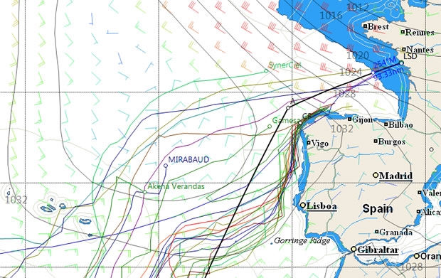 On the water SynerCiel is still some distance away, now around 180 miles to the north of Gamesa. SynerCiel is still making hay in 25 knot northwesterlies while Gamesa is substantially more headed as she attempts to get past Cape Finisterre (currently some 100 miles west of the Spanish coast).