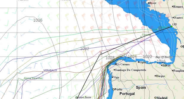 After a windy night the breeze is still blowing a solid 35-40 knots from the northwest. Fortunately there hasn't been a massive wind shift preceeding this so hopefully the sea state on the Bay of Biscay won't be too heinous. Unfortunately Mike Golding says otherwise. He reported this morning: "At the moment all I am interested in is concentrating on dealing with the weather. My only focus right now is just concern to get through the weather right now safely. I have 40 knots of breeze and a really nasty sea state."