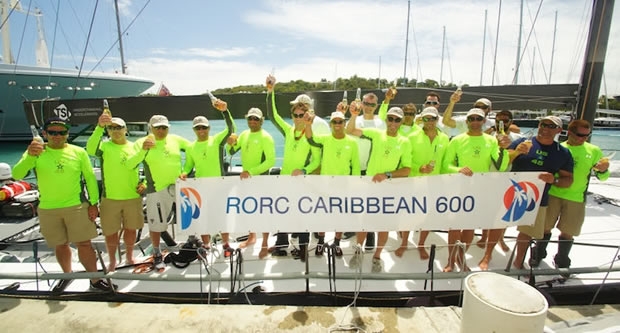 In the closest finish in the history of the RORC Caribbean 600, Hap Fauth's JV72 Mini Maxi Bella Mente arrived in Antigua to take monohull line honours just 10 minutes ahead of George David's RP90 Rambler, the line honours favourite, followed just over two minutes later in third by George Sakellaris's RP72, Shockwave. Bella Mente's elapsed time for the 600 mile course was 48 hours, 5 mins, 44 seconds.