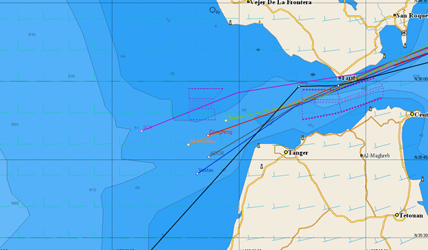 By the 07:00 UTC sched this morning Team SCA was well past the Strait's busy shipping lanes and continuing west while behind her Team Vestas Wind was taking a different tactic and heading southwest. Since then it has been possible to follow the boats on AIS. This showed Abu Dhabi Ocean Racing had followed Team Vestas Wind southwest while the boats behind are taking a median between that of Team SCA and Vestas. Significantly, out to the west Team SCA was making 8.7 knots while those close to the Moroccan coast were making 12.