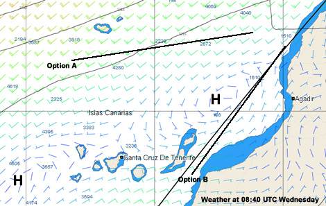 Option B - to head southwest around the west side of high, hard pressed in southwesterlies but in more reliable breeze.