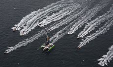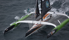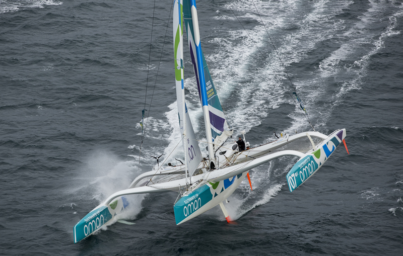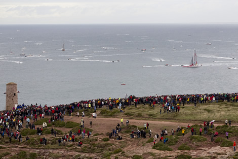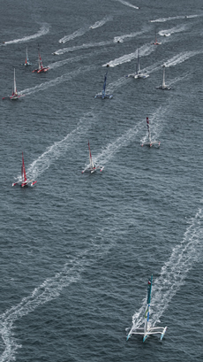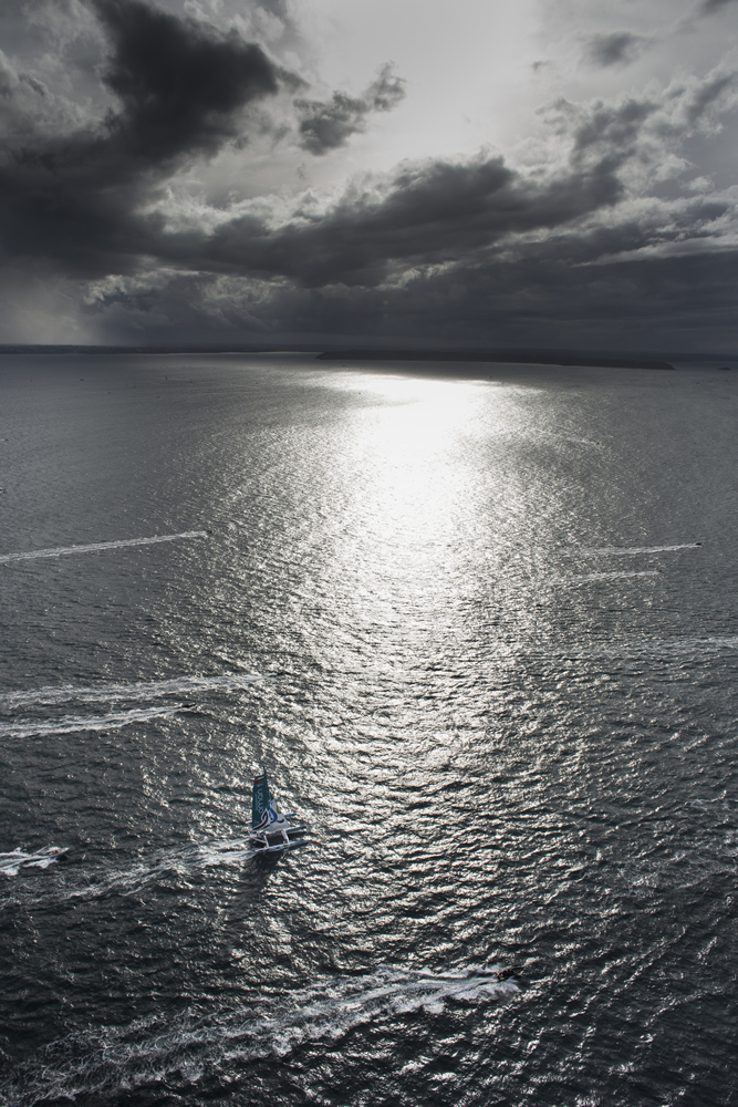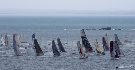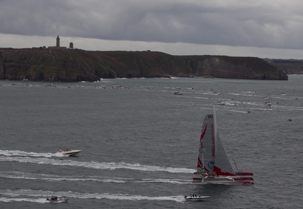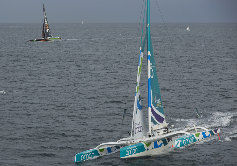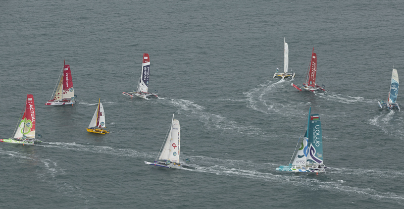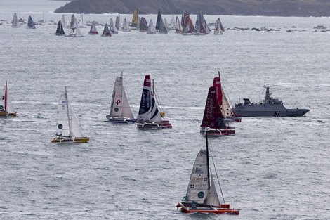 The Sidney Gavignet skippered Musandam-Oman Air led the Ultime class off the start line but was soon overhauled by Thomas Coville on his new Sodebo Ultim. However at the Cape Frehel turning mark 18 miles from the leading the Ultimes was 2006 outright Route du Rhum winner and 2010 Multi50 victor Lionel Lemonchois with his 80ft trimaran Prince de Bretagne.