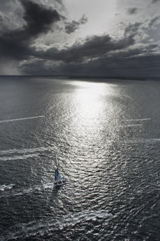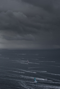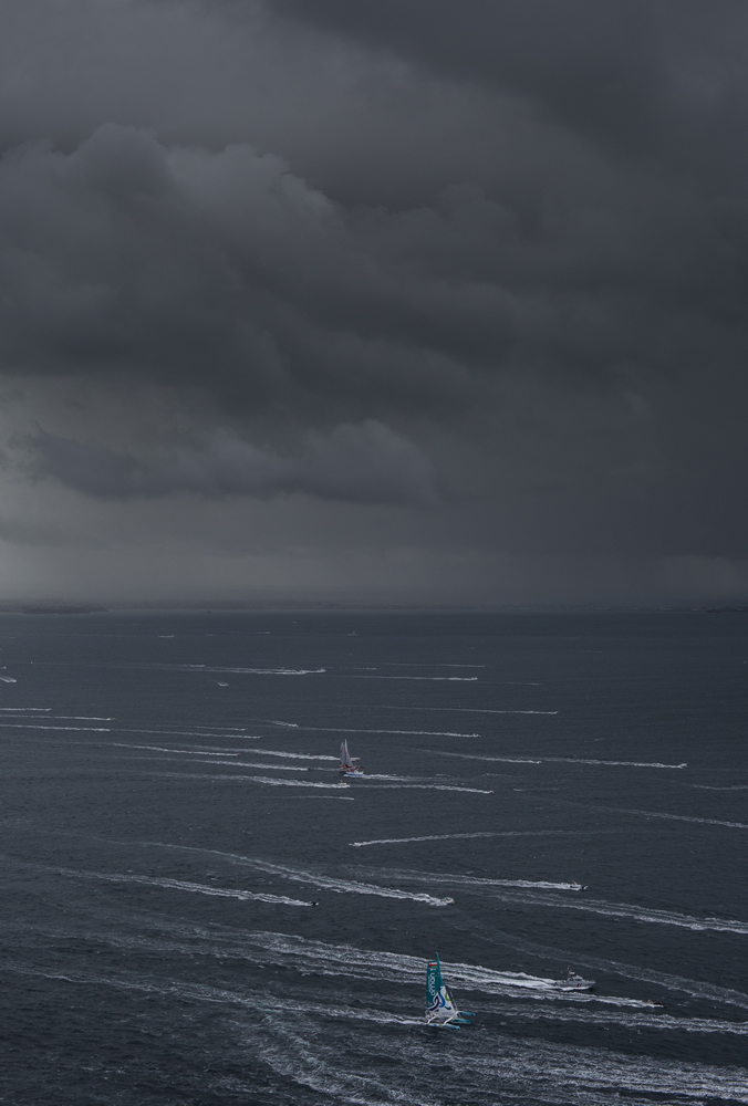 With a front forecast to strike the fleet at the start, in fact the race got underway under grey skies and a 15-17 knot SSWerly. However as the boats charged headlong to Cape Frehel the skies blackened and the front passed through hiking up the wind and bringing a sudden torrential downpour. However this was small fry compared to the 40+ knot gusts the boats are expected to endure as another front crosses them at around midnight tonight.