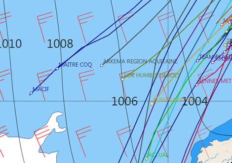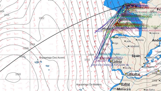 The boats are still experiencing brutal 30+ knot NNWerly conditions but most noticable is the IMOCA 60s are taking a more southwesterly course than the Ultimes and don't look like they will be shaving Cape Finisterre anything as like as closely. In fact at present the boats are on a course taking them directly into the centre of the high which suggests that, with the high moving south later this week, they may be looking at the upwind option around its north side but we can't see that panning out with the high forecast to return north by this weekend...