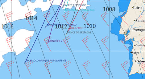 At present Banque Populaire's course should see her shave the west coast of Madeira (315 miles away at 10:48 UTC). While at present there appears to be a light patch to the west of Madeira, the well-behaved high looks set fill in here later today...in short a glamour forecast for the big multis. The boats which appear to be heading east more will be looking to stay in margin stronger breeze at the expense of sailing more miles.