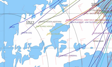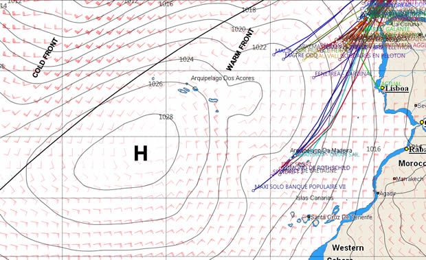 While the Ultimes are taking the southerly route around the high, the rest of the fleet look set on taking the more arduous northerly route around it. Effectively they are sailing an 'upwind' Route du Rhum. This is presumably because the Azores high is generally too far south for these smaller slower boats to take the massive detour the long legged Ultimes can.