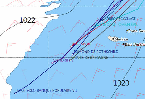 Peyron passed Madeira at around 2300 UTC last night and since yesterday morning has increased his lead over second placed Spindrift 2 now to more than 100 miles. Since Madeira both skippers have put a little more right into their courses, now taking a more southwesterly course. At the latest sched both have fallen into a slightly lighter part of the trades. However they will emerge from this shortly and will then be back into 20 knot NNEerlies that will gradually veer as they pass around the bottom of the high. However don't imagine that the skippers will be in a hurry to gybe their enormous boats on every shift...