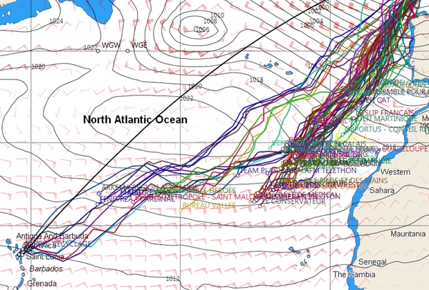 Meanwhile in the IMOCA class, with annoyingly relentless perfection to his sailing, Francois Gabart and MACIF continue to lead. Apart from a hitch to the northwest over the early hours of yesterday morning, MACIF and second placed Maitre Coq have been continuing a long, long port gybe that at present has them laying the north end of Guadeloupe. At present they are sailing deep on port gybe in 15-20 knot easterlies and while it is currently northeasterly closer to the Caribbean, this looks set to veer usefully into the ESE and drop slightly as they approach Guadeloupe, the finish line still 914 miles away from MACIF at the 08:48 UTC sched this morning.