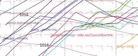 Leading the group behind them is former Mini sailor Pierre Brasseur on the Owen-Clarke designed Matouba in fifth, very much punching above his weight, while Miranda Merron on Campagne de France is currently positioned to the north. However she has Stephane Le Diraison on Ixblue-BRS and Fabrice Amedeo on SNCF Geodis-Newrest breathing down her neck, both within 10 miles of her and set to pass behind her (on the favoured gybe in terms of DTF) when she comes across on port gybe this afternoon.