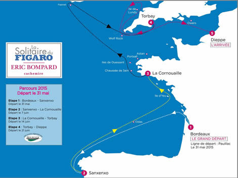 “The 2015 edition of the Solitaire du Figaro is set to be a long race covering the largest geographic area the race has seen for many years,” reported Solitaire du Figaro Race Director Gilles Chiorri. “Sailing as far south as Spain and as north as the UK, the distance will for sure take its toll on the skippers – it will be a tiring and intense solo endurance race. It will be really important for the skippers to pace themselves over the four stages and they’ll need every ounce of their skill to get them to the finish line.”