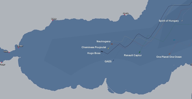 GAES Centros Auditivos' Anna Corbella and Gérard Marin continue to punch above their weight and are taking a more southerly route, towards the Algerian and Moroccan coast where there can be some better breeze, but there is more contrary current on this side so this could be a higher risk option. Meantime they have seen third place slip to Neutrogena. Guillermo Altadill and Jose Muñoz are following a similar track to Hugo Boss and Cheminees Poujoulat, and have had a good night with solid average speeds.
