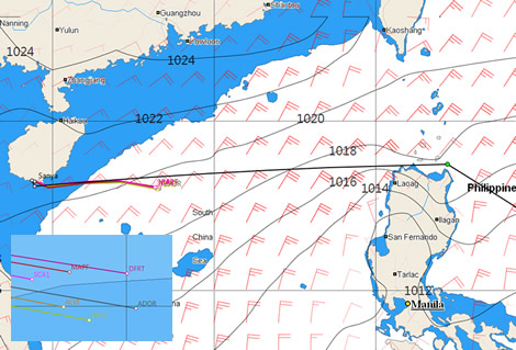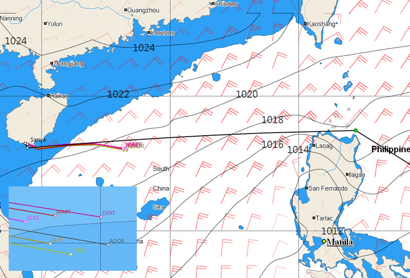 With the wind in the northeast, overnight UTC the boats have en masse drifted south of the great circle to Luzon Strait as they cross the South China Sea at 11-12 knots to the next turning mark at the northern tip of the Philippines.