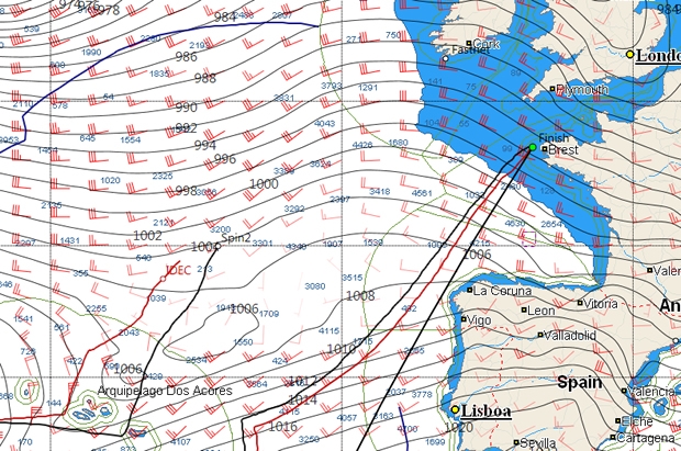 At present both boats are still on port tack heading NNE waiting for the wind to veer slightly so they can put a bit more east into their respective headings, setting them on a course towards southern Ireland, before they put in their last gybes for the Lizard-Ouessant finish line. So, like Banque Populaire V four years ago, it looks like they will both be approaching the line at an angle of almost 90° from the great circle to the finish (ie directly up the Atlantic).